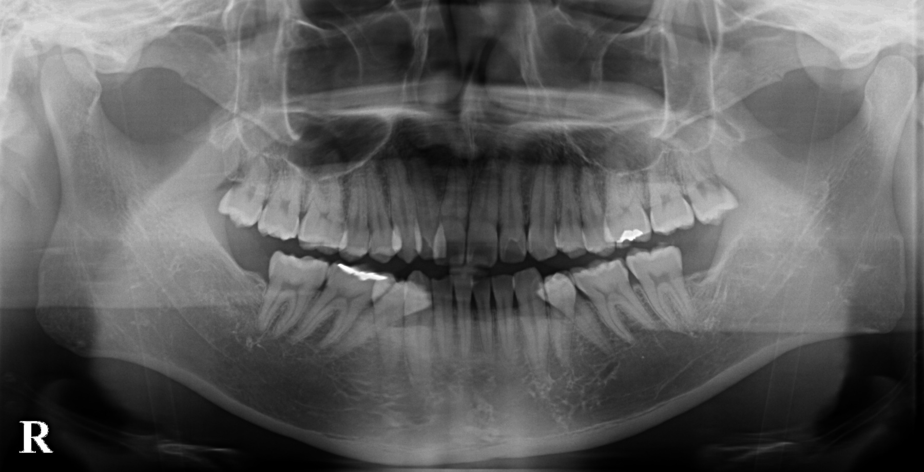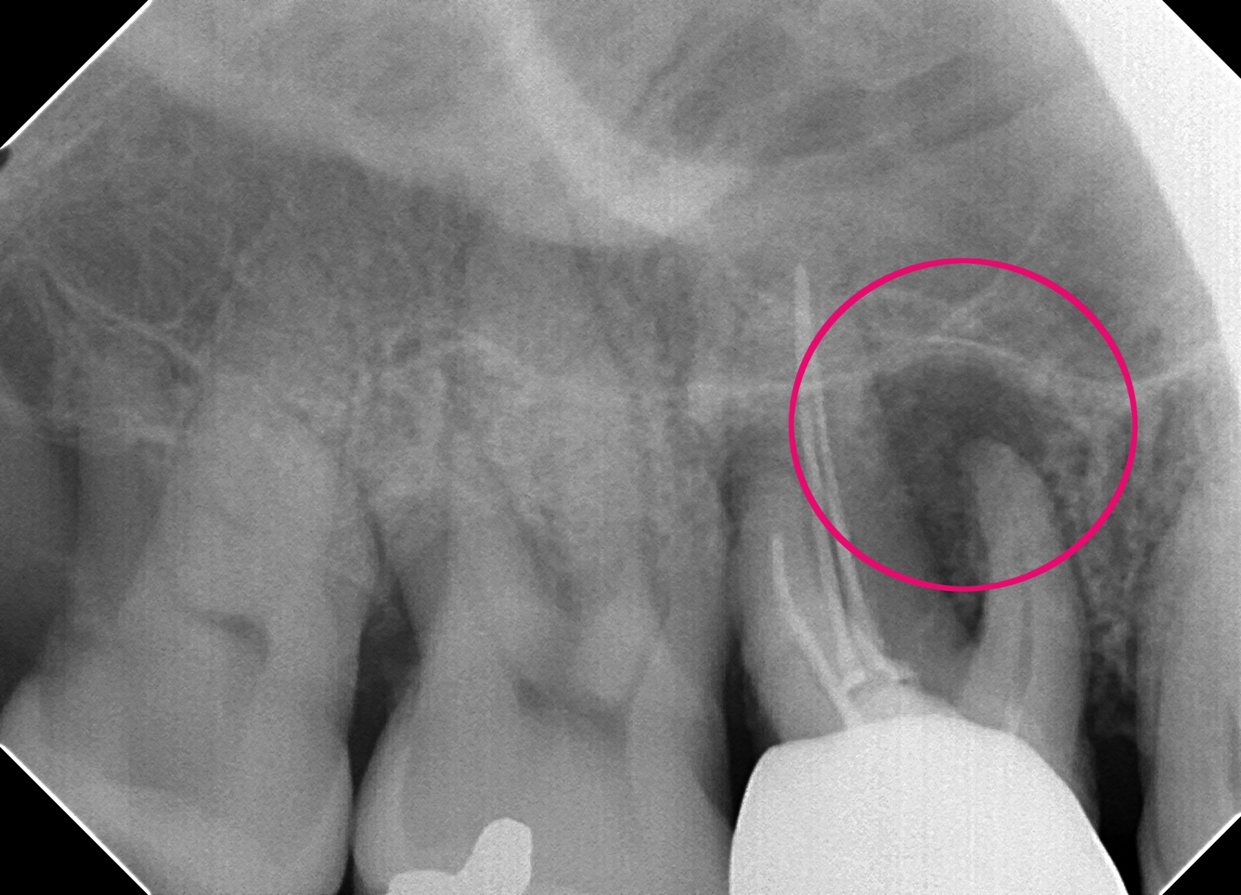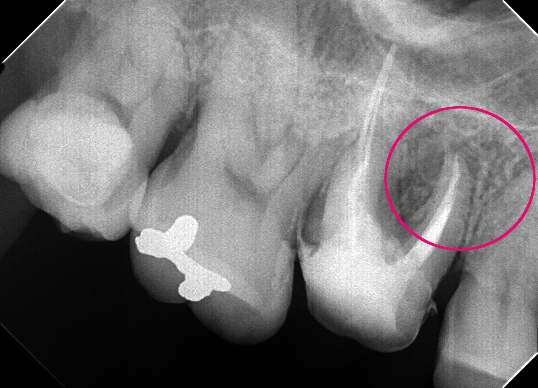 歯の根の先にうみが貯まり、レントゲンに黒く映っています。